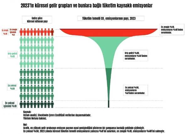 Örneğin zengin bireyler, tüketim ve yaşam tarzları kadar (daha çok da) yatırımlarıyla iklim krizini körüklüyor. Dünya genelinde, en zengin yüzde 1’lik kesim küresel tüketime dayalı emisyonların yüzde 15’ini yaratırken, özel sermaye sahipliği ile ilişkili küresel emisyonların yüzde 41’ini oluşturuyor. (2)